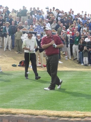 Eventual winner Jonathan Kaye leads the march to the green on the 16th hole – Phil Mickelson and the TV folks in tow.
