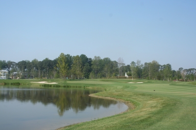 The par five seventh is the one you’ll remember most from The Peninsula, as it runs along the Indian River Bay. Sand stretches from tee to green encompassing one huge waste bunker, but the sand also helps you aim away from the trouble. The approach is deceiving with bunkering short of the green, and the wind can play havoc with your distances to this long but narrow green.