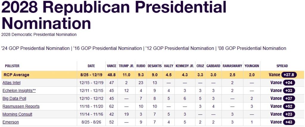 But Christmas is a great time to dream, isn’t it? The list of possible contenders should grow as 2026 travels through the months, with most people-in-the-know thinking that two full years, more or less, would be needed to lay the groundwork for a credible campaign under today’s evolved circumstances. Running for president ain’t what it was before Donald Trump, put it that way.
